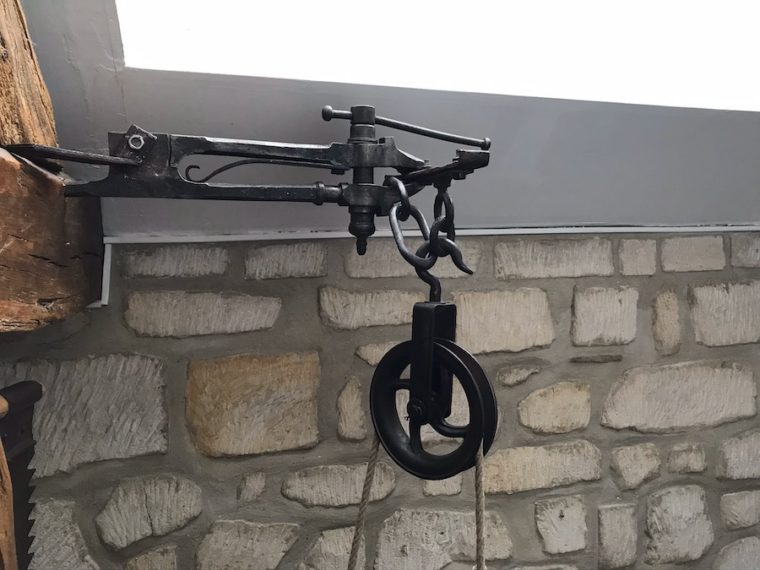 Assemblage étau / lanterne / poulie en suspension / corde fait à la main pour cacher les fils d’électricité