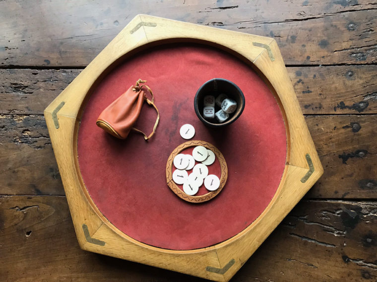 Cette piste de jeux faite maison de cuir, tissu, bois et cuivre.